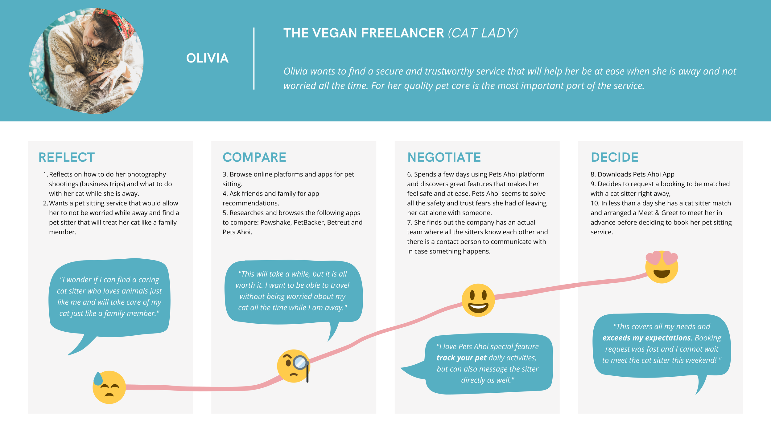One specific profile was chosen in order to develop a User Journey. The User journey translates how the Pets Ahoi app is solving a real problem for this specific User Persona.